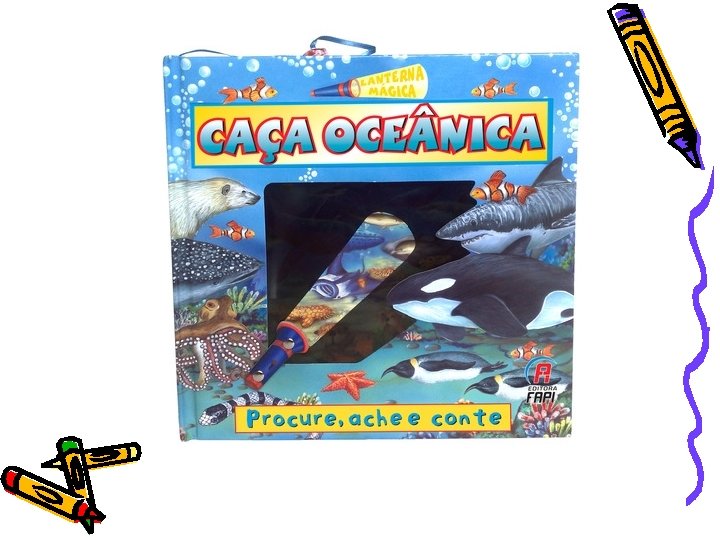 Caça Oceânica. Procure, ache e conte • Editora FAPI • Livro vem com uma lanterna mágica e tem atividades para que a criança encontre os objetos e animais solicitados. Depois, a criança pode contar uma história a respeito do que encontrou. • R$ 29, 90