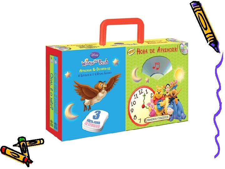 Hora de Aprender! • Editora Primeiros Conceitos • 4 livros + 1 CD de áudio com as histórias • Histórias que podem ser lidas ou ouvidas, cada história introduz conceitos de: dias da semana, meses, estações do ano e horas • R$ 39, 90 (Livrarias Curitiba)