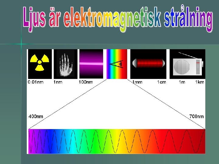 Vad är ljus? • Ljus är elektromagnetisk strålning, samma typ av strålning som bl a röntgenstrålning, uv-ljus eller infrarött ljus • Ljus kan beskrivas som en partikelstråle, en stråle av fotoner, energiknippen • Ljus kan också beskrivas som en vågrörelse våglängd