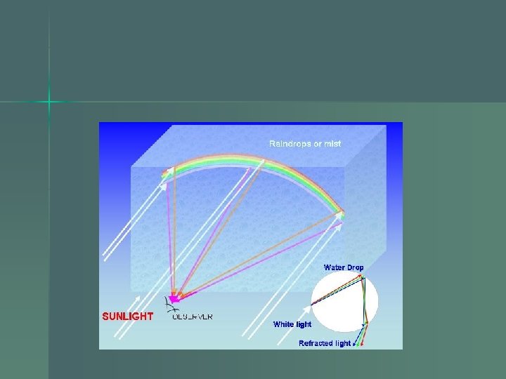 Solstrålarna reflekteras och bryts i miljontals regndroppar i luften.