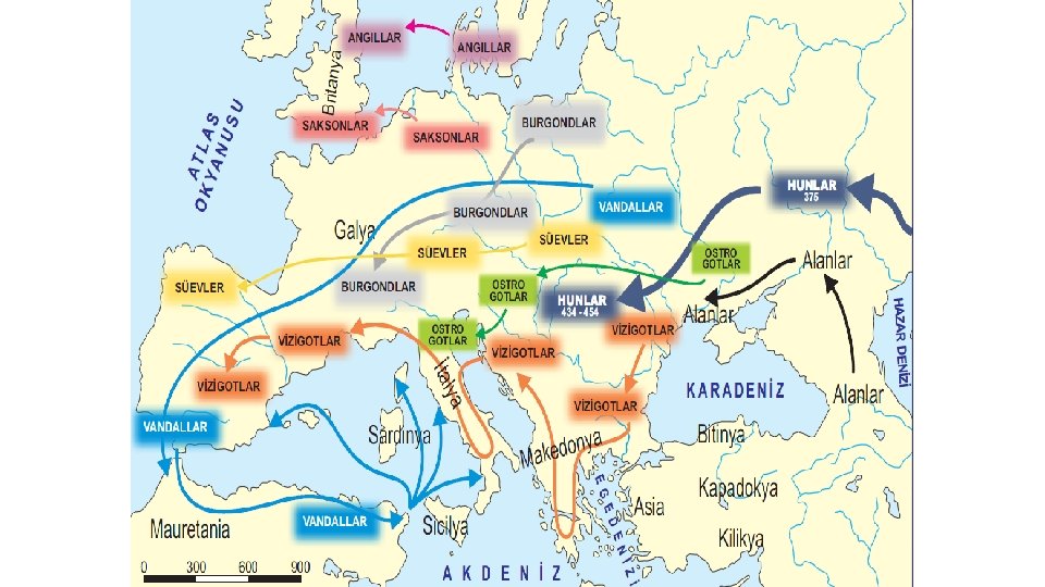 İlk VE İKİNCİ Dönem Kavimler Göçü'nün Sonuçları ü Roma İmparatorluğu 395'te ikiye ayrılmıştır. Batı Roma İmparatorluğu ve Doğu Roma İmparatorluğu (Bizans) üAvrupa yüzyıla yakın bir süre karışıklıklar içerisinde kalmıştır. üİlk çağ sona ermiş, Orta Çağ başlamıştır. üBarbar kavimler arasında Hıristiyanlık hızla yayılmıştır. Cermenler, Hıristiyanlığı kabul ederek Ortaçağ Avrupa'sına damgalarını vurmuşturlar. ü Göçlere dayanamayan Batı Roma İmparatorluğu 476'da yıkılmıştır.
