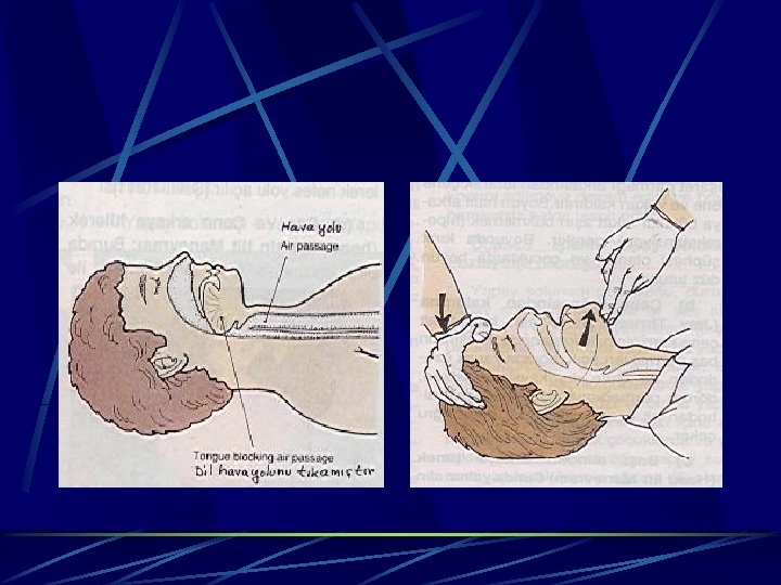 3 TEDAVİ A) HAVA YOLUNUN AÇIK TUTULMASI GEREKİR (HAVA YOLU TEMİZLENMELİ, SOLUNUM YOLUNU TIKAYAN CİSİM VARSA ÇIKARTILIR B) SOLUNUMUN SAĞLANMASI İLK YARDIMDA YAPILACAK İŞ SOLUNUMUN OLUP OLMADIĞIDIR. EĞER SOLUK ALIP VERMİYORSA SIRT ÜSTÜ YATIRILIR HASTANIN SAĞINA GEÇİLİR KIRAVAT VE YAKASI VE BEL KAYIŞI GEVŞETİLİR C) BAŞI GERİYE DOĞRU BASTIRILIR BİR ELİNİZLE ALNINDAN BİR ELİNİZLE ÇENESİNDEN AŞAĞIYA BASTIRILARAK AĞZI AÇILIR SOLUNUM YOLUNU TIKAYAN CİSİM VARSA ÇIKARTILIR DİLİ ÇEKİLİR SAĞ ELİNİZLE ÇENENİN ALTINDAN SOL ELİNİZLE BURUN DELİKLERİ TIKANARAK AĞIZA YAKLAŞTIRILIR DERİN HASTAYA HAVA ÜFLENİR GÖĞÜS KAFESİ YUKARI ÇIKINCA KESİLİR ON BEŞ YİRMİ DAKİKA DEVAM EDİLEBİLİR