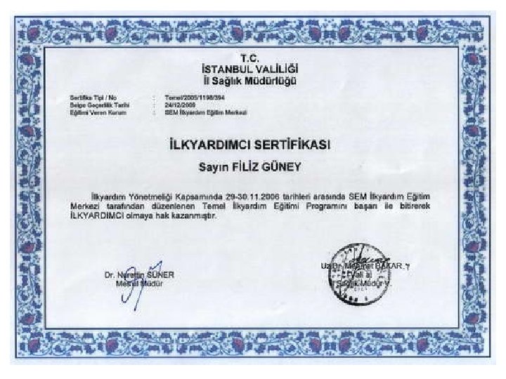 KİMLER İLKYARDIM YAPABİLİR? • İlkyardım bir kesinlikle bir tedavi biçimi değildir. Bu nedenle Temel İlk Yardım Eğitimine katılıp “ilkyardımcı sertifikası” almış olan herkes ilk yardım yapma hakkına sahiptir.