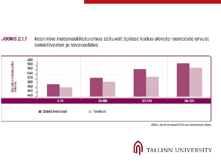 Soovitused (Põder ja Lauri) • Võrdseid võimalusi soodustav valikupoliitika – Pedagoogiline mitmekesisus – Kooreriisumise vältimine – Informeeritud valikute toetamine Rootsi poliitika: sõltumata kooli omandivormist rahastatakse koolikohti universaalse osakuga Tsentraalselt disainitud valikuprintsiibid, osalised kvoodid piirkonna lastele ning haavatamatele peredele; suurem pearaha koolidele, kes on vastu võtnud viletsama sotsiaalmajandusliku taustaga õpilasi Koolivaliku nõustamine, toetavad teenused (koolibuss, pikapäevarühm)