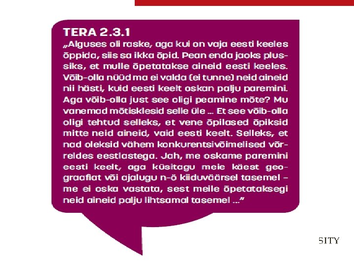 Eestikeelsele õppele üleminek • Eestikeelsele õppele ülemineku alustamine kõrghariduse ja siis gümnaasiumitasemelt tekitanud probleeme, mis oleksid olnud välditavad – Klaaslae lõks – venekeelsete noorte võimetus jõuda tööturul eestlastega samaväärsete kohtadeni – Piisav keeleoskus gümnaasiumis eesti keeles õppimiseks C 1 tase, seadus nõuab vaid B 1 taset, paljudel ei ole sedagi – Kontrast eestikeelsele õppele üleviimise võimaluste võrdsustamise eesmärgi ja reformis osalemise tulemusena tekkinud isiklikus konkurentsivõimes ilmneva ebakindluse vahel – noorte ebavõrdsuse teravdatud tajumine, umbusk laiemalt Eest riigi ja tema institutsioonide suhtes