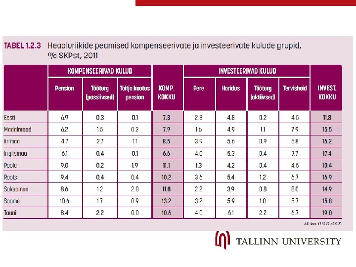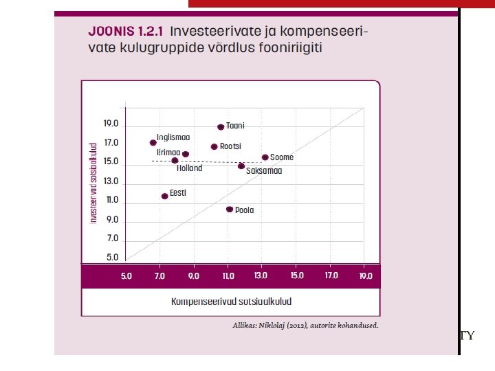 Võimestav heaoluriik • Üleminek seniselt jaotavalt ja kompenseerivalt heaoluriigilt võimestavale – Investeerivad teenused (võimekust parandavad): lastehoid, haridus, teadus, aktiivne tööturupoliitika, taastusravi – Kompenseerivad tulusiirded: pensionid, töövõimetus- ja tööturutoetused