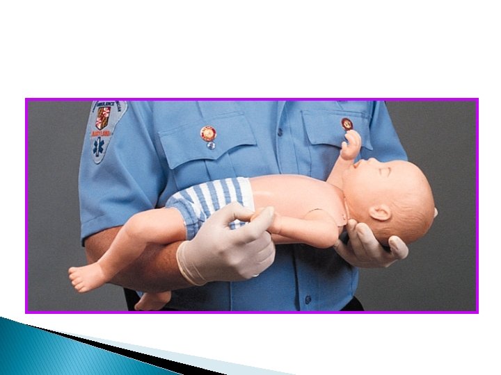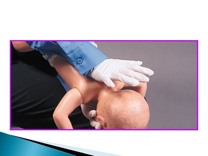 Bebeklerde tam tıkanıklık olan hava yolunun açılması � Bebek ilkyardımcının bir kolu üzerine ters (yüzüstü ) olarak yatırılır, � Başparmak ve diğer parmakların yardımıyla bebeğin çenesi kavranarak boynundan tutulur ve yüzüstü pozisyonda öne doğru eğilir, � Baş gergin ve gövdesinden aşağıda bir pozisyonda tutulur, � 5 kez el bileğinin iç kısmı ve el ayası ile bebeğin sırtına kürek kemiklerinin arasına hafifçe vurulur