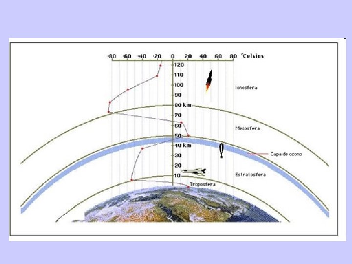 Estado de ionización Neutrosfera: (hasta 80 Km). Capa atmosférica con las partículas no ionizadas (hasta la mesopausa). Ionosfera: (80 -400 Km). Capa atmosférica con predominio del oxígeno en la que encontramos partículas ionizadas. En esta capa se producen fenómenos como la reflexión de las ondas de radio y de televisión.