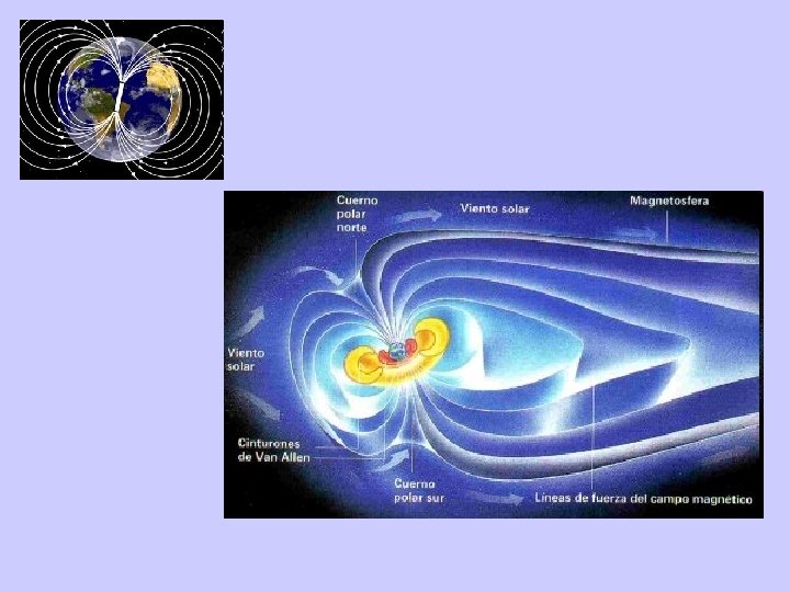 MAGNETOSFERA La Tierra se comporta como un imán cuyos polos coinciden casi con el eje de giro. Se deja sentir más allá del límite de la atmósfera gaseosa, hasta cinco veces el diámetro terrestre (60. 000 Km). La magnetopausa no tiene forma esférica porque el viento solar (p+ y e- de alta energía a 400 -800 Km/s) la deforma por el lado opuesto al sol dando una cola de hasta 10 Km desviando y dispersando estas partículas.