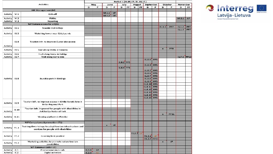 WP: Management - meetings - 06. 17. Kick-off in Kretinga V - 08. -09. 11. 17. Period 2 meeting in Kurzeme V M. 2. 1. - Period 3 meeting in Aukštaitija National Park April/May 2018 - Period 4 meeting in Biržai Regional Park November 2018 M. 1. 1. , M. 1. 2 1 delegate to Project Coordination Group 01. 05. 17. -31. 10. 17. 01. 17. -30. 04. 18. 01. 05. 18. -31. 10. 18. 01. 18. -30. 04. 19. 1 delegate to Project Steering Group