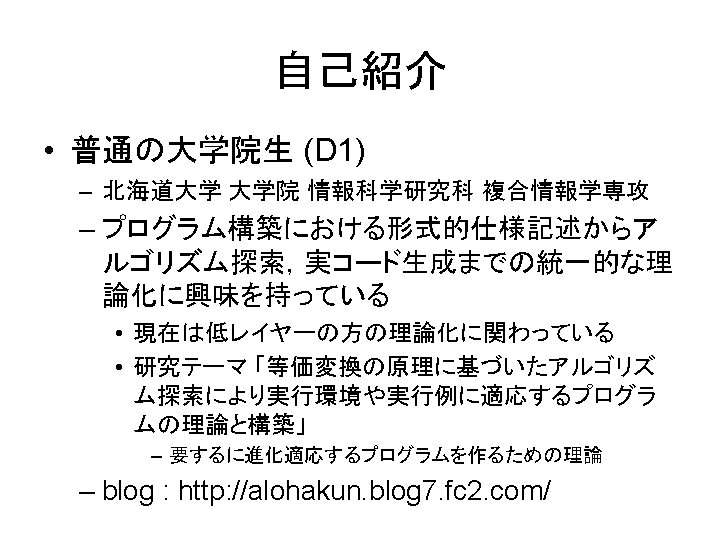 パネルディスカッションの元ネタ • Running C and Python Code on The Web – http: //www. toolness. com/wp/? p=52 – Scott Peterson (Adobe) ‘s toolchain – C code to be targeted to the Tamarin VM • C言語をブラウザで実行、Ruby/Python/Perlも然り – http: //journal. mycom. co. jp/news/2008/07/10/031/ind ex. html • 移植性 ⇔ 効率性のトレードオフを解消できる技術と 来たら,ブラウザへの応用は自然と言える