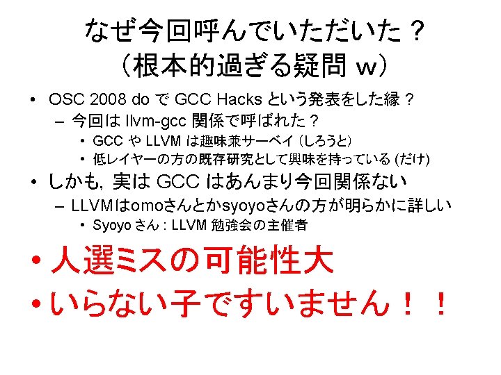 ここから LLVM の話 • ちなみに LL Future の LL とは全く関係無い – LLVM is NOT a Lightweight Virtual Machine. – LLVM is NOT a Virtual Machine design for Lightweight Language. • ようこそ Low. Level の世界に ! – 話者のレベルが LL という噂も