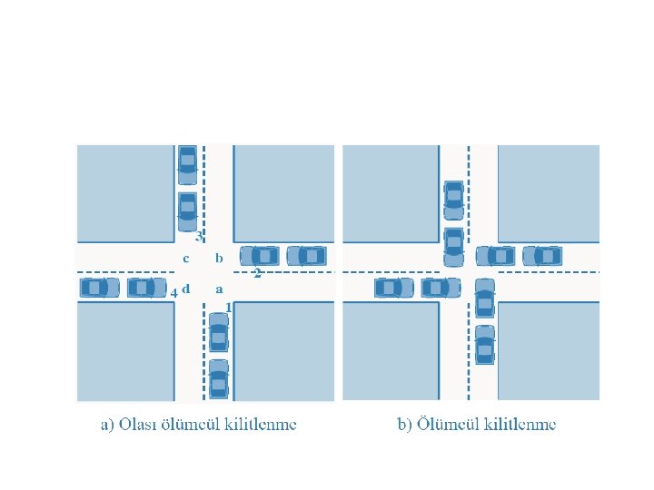 Ölümcül Kilitlenme İşlemci I/O Kanalları Ele Geçirilebilir (Pre-emptable) Semaforlar Bilgisayar Kaynakları Ele Geçirilemez (Non Pre-emptable) Ele geçirilebilir kaynak, bir görev bu kaynağa sahip ise elinden alındığında problemler oluşturmayan kaynaktır. Ana bellek İkincil bellek Aygıtlar Veritabanı Kesmeler Sinyaller Mesajlar Dosyalar Yazıcılar, Tarayıcılar I/O tampondaki bilgiler CDROM Yazma Ele geçirilemeyen kaynak, görev bu kaynağa sahiptir ve elinden alınamaz.