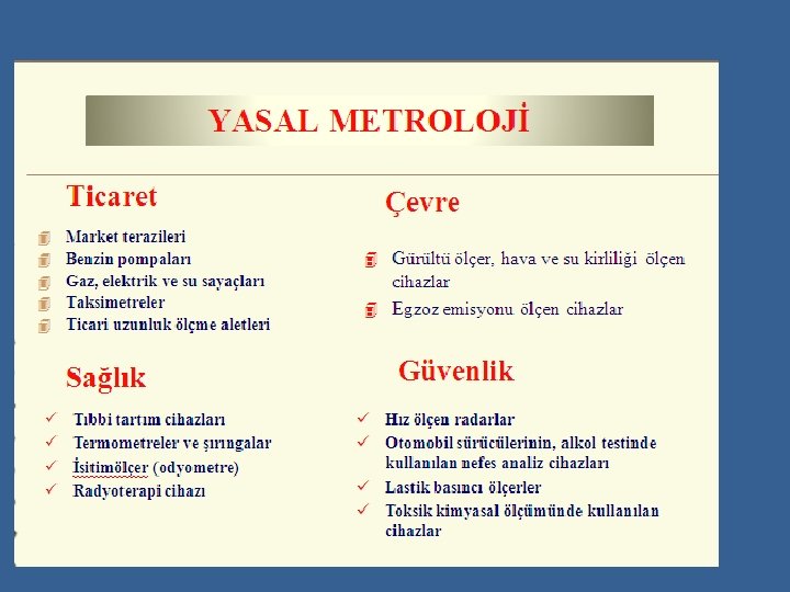 • Kamuyu doğrudan ilgilendiren ve ticarete konu olan ölçümlerin denkliğinin ve güvenilirliğinin temini ile ilgili metrolojik faaliyetler yasal metroloji kapsamındadır. • Güvenilir ölçüm, özellikle ihtilafa düşüldüğünde veya doğru olmayan ölçümler kişiler veya toplum için karşı risk teşkil ettiğinde önem kazanır. Yasal metroloji, ulusal, bölgesel ve uluslararası düzeyde etkili ticareti sağlayan ölçüm güvenilirliği için temel teşkil eder.