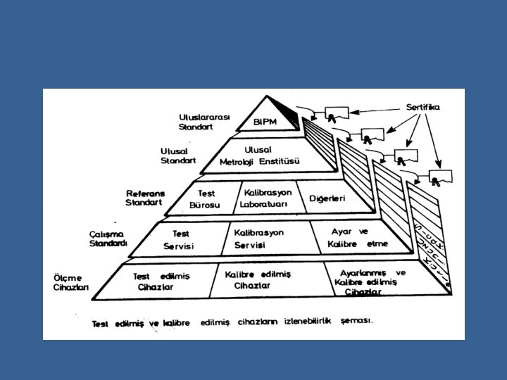 • Kalibrasyon ; belirli koşullar altında, bir ölçme cihazı veya bir ölçme sisteminin gösterdiği değerler veya, bir maddi ölçüt veya bir referans malzemenin verdiği değerler ile ölçüm standartları ile gerçekleştirilen ve bunlara karşılık gelen değerler arasındaki ilişkiyi kuran işlemler dizisi olarak tanımlanır. • Test ; Bir ürün veya cihazın belirlenen şartlara uygunluğunun kontrol edilmesidir. • Analiz ; Verilen bir maddeyi veya malzemeyi oluşturan yapı taşlarını bulmak için yapılan işlemler dizisidir.