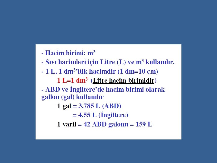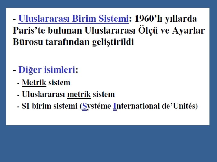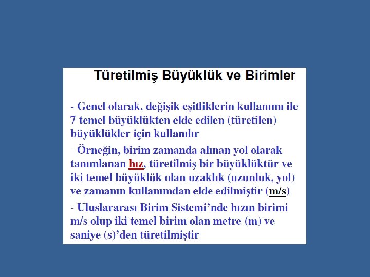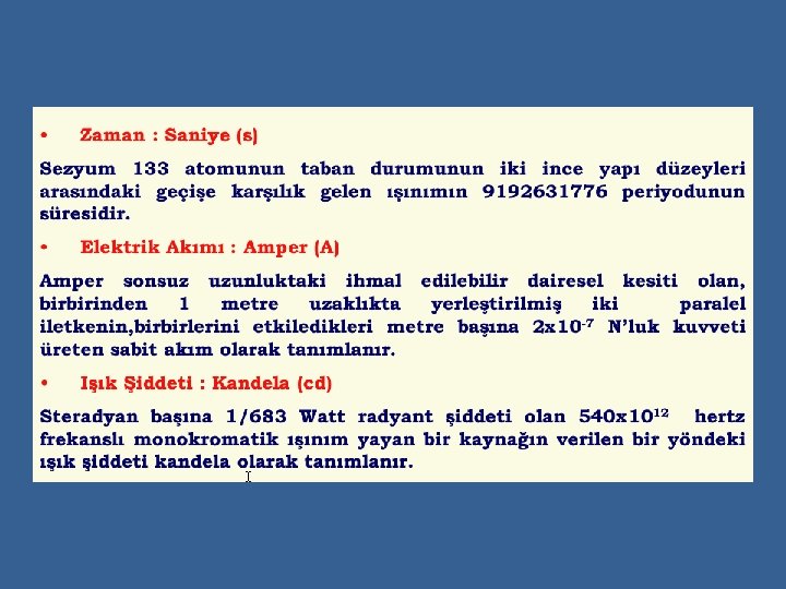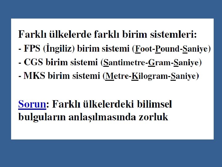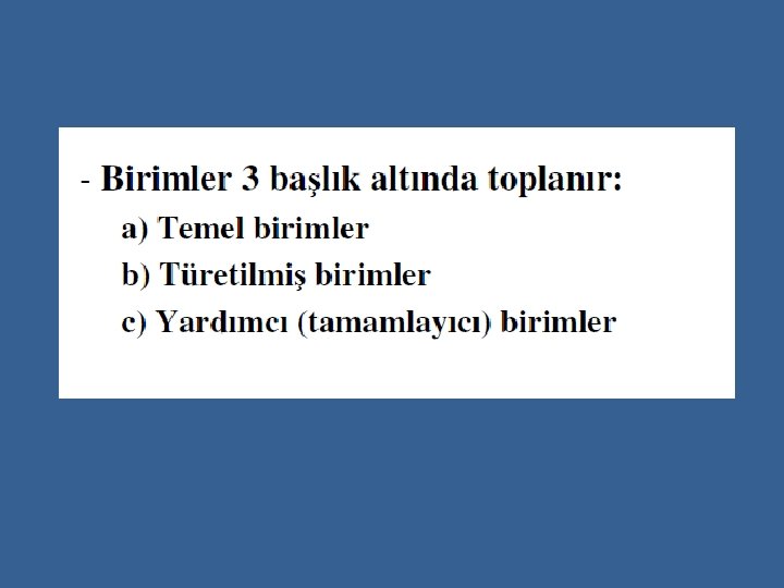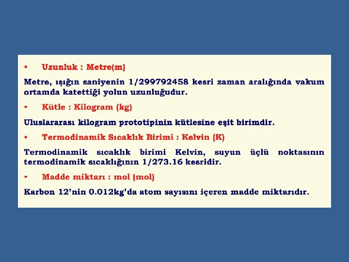 • Birim: Aynı cinsten olan, aynı ölçü ile tesbit edilen fizksel büyüklüklerin sayısal değerinin tesbiti için mukayese (karşılaştırma) büyüklüğüdür. Genel anlamda iki çeşit ölçü birimi vardır: • 1. Doğal ölçü birimleri : Mesela saniye gibi. Doğal ölçü birimlerinin her yerde ve her zaman röprodüksiyonu yapılabilir. • 2. Cisimli ölçü birimleri : Mesela kilogram gibi Bunların elverişli ve uygun şartlar altında değeri değişmez.