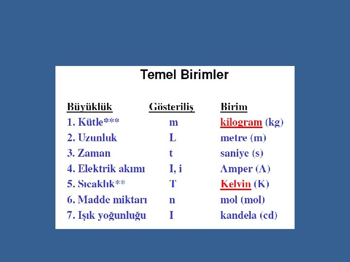 Hangi büyüklükleri ölçeriz? Temel Büyüklükler SI birimleri adı verilen bu birimler; Ölçümlerde kullanılan diğer tüm büyüklükler, bu 7 temel büyüklükten türetilir.
