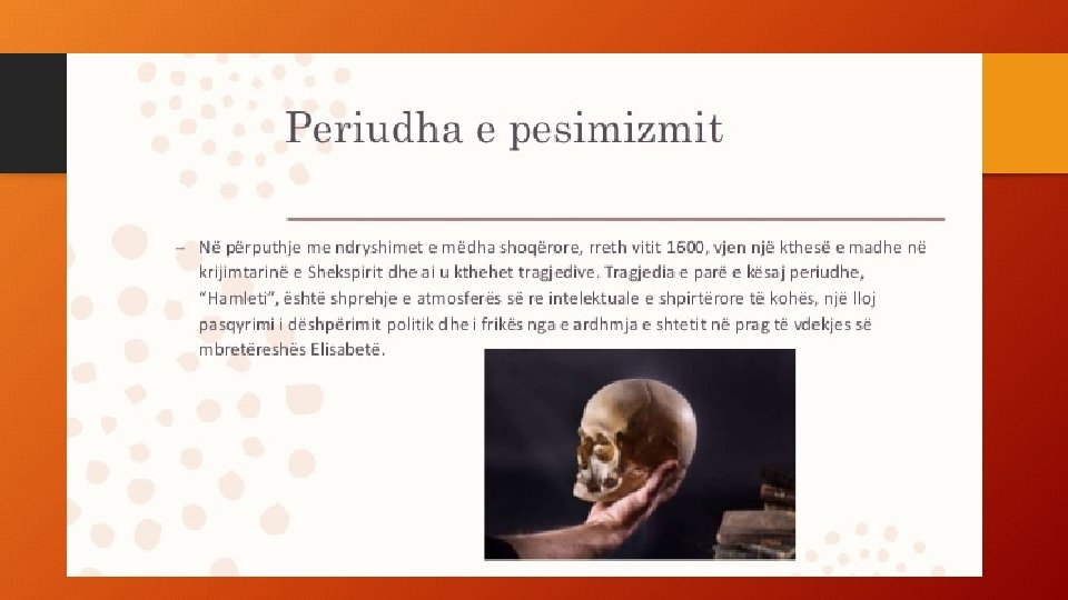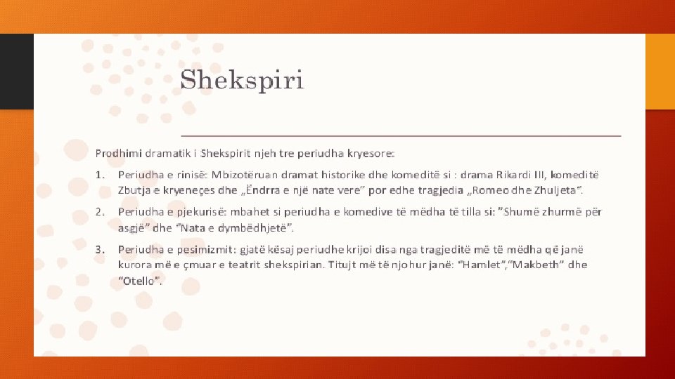 • • • PERIUDHA E RINISË(1588 -1595) drama "Rikardi i III" komedia "Zbutja e kryeneçes" komedia "Ëndrra e një nate vere" tragjedia "Romeo dhe Zhuljeta Periudha e pjekurisë (1595 -1602) • komeditë: "Shumë zhurmë për asgjë" • "Si të doni ju" • "Nata e dymbëdhjetë" Periudha e pesimizmit(1602 -1610) • tragjeditë: "Hamleti " • "Makbethi « • "Otello • " Mbreti Lir"