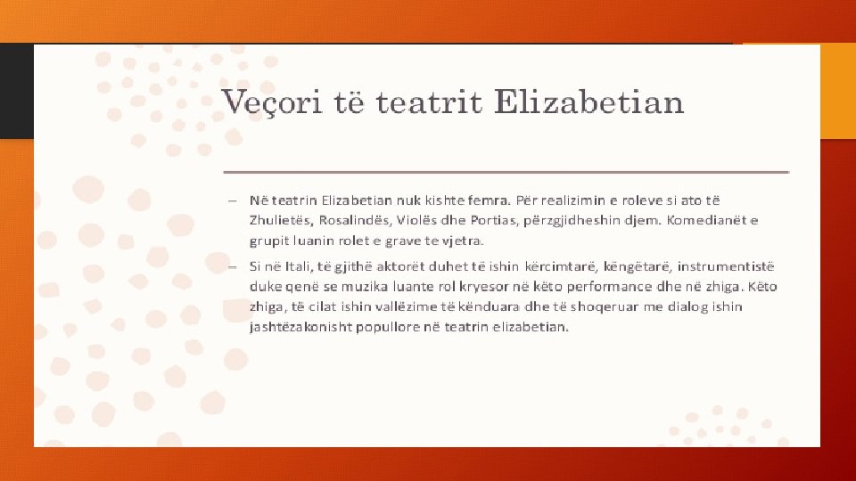 Arti i Shekspirit • Progres i dukshëm në të gjithë përbërësit • Ngjarjet vijnë në kohështrirje të ndryshme gjeografike • Zgjidhja e konfliktit me forcë shpirtërore • Shtysat e veprimit gjenden në natyrën njerëzore (urrejtja, hakmarrja, krenaria, smira) • Problematikat origjinale dhe laike • Temat patën karakter universal • Subjekte të larmishme • Heronjtë e zbulojnë thelbin mes sprovash të tendosura