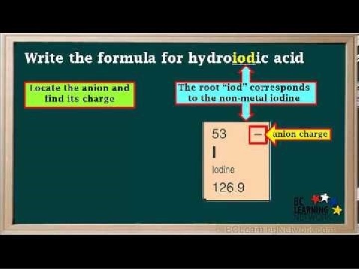 Naming Acids � written with subscript (aq) For acids formed from Hydrogen + a single element from the periodic table: � Hydrogen + _____ide = Hydro _____ic acid � HF(aq) �hydrogen fluoride �hydrofluoric acid