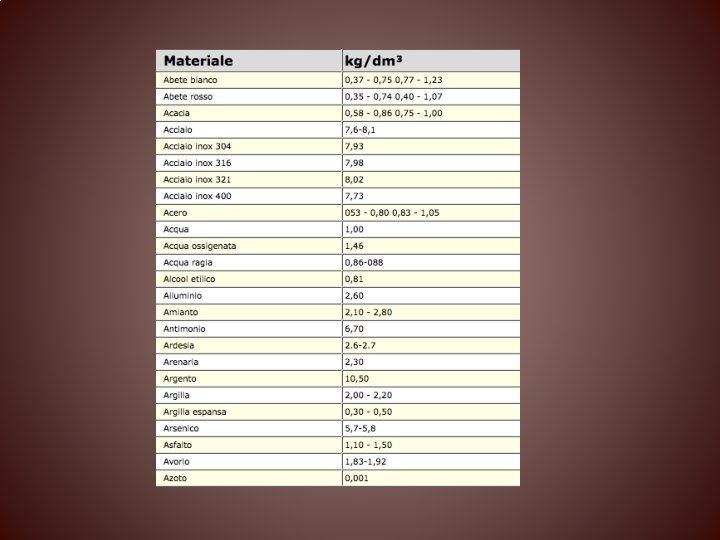 Il peso specifico • Ogni sostanza a parità di Volume ha un suo peso caratteristico: il peso specifico (esistono le tabelle che riportano il peso specifico per le diverse sostanze