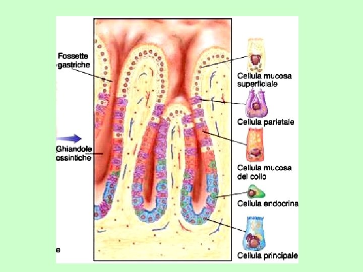 Caratteristiche delle diverse aree fisiologiche • Area cardiale (5%): ghiandole tubulari ramificate e spirali con cellule quasi esclusivamente mucose (muco, bicarbonato, pochi elettroliti) • Area del fondo e del corpo (75 -80%): ghiandole tubulari semplici con cellule mucose, cellule principali, cellule parietali ed enterocromaffini • Area pilorica (15 -20%): ghiandole tubulari ramificate con cellule mucose (poche), cellule D e cellule G