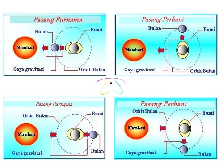 Tipe pasang surut 1. Pasang purnama itu terjadi pada saat Bulan purnama, yaitu ketika Matahari, Bumi, dan Bulan terletak dalam satu garis lurus. Pasang purnama merupakan siklus pasang yang paling tinggi dalam satu siklus pasang-surut. 2. Pasang perbani merupakan pasang paling rendah dalam periode satu siklus pasang-surut. Pasang perbani terjadi pada kedudukan Matahari, Bumi, dan Bulan membentuk sudut 90 derajat.