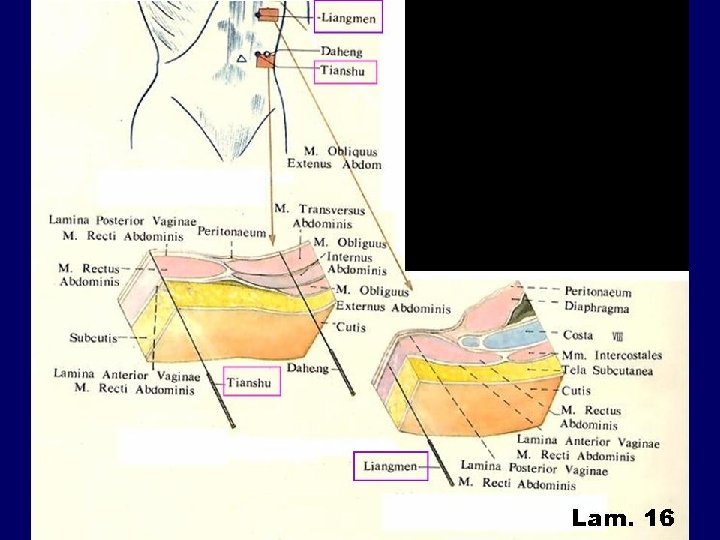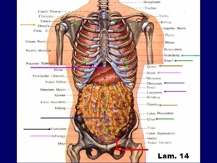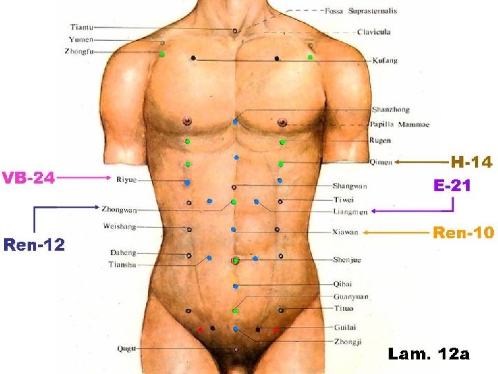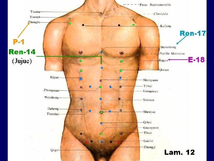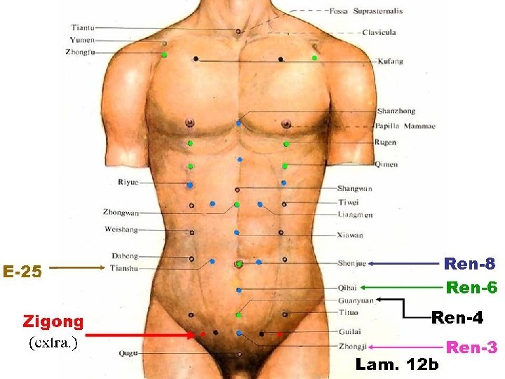 En las láminas siguientes, aparecen ordenadamente los puntos 1. 2. 3. 4. 5. 6. 7. 8. Zhongfu P-1 Shanzhong Ren-17 Rugen E-18 Jujue Ren-14 Qimen H-14 Riyue VB-24 Zhongwan Ren-12 Liangmen E-21 9. Xiawan Ren-10 10. Shenjue Ren-8 11. Tianshu E-25 12. Qihai Ren-6 13. Guanyuan Ren-4 14 Zhongji Ren-3 15. Zigong (del abdomen) (extra. )