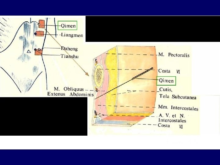 • Qimen (H-14): en la línea medio-clavicular, en el 6° espacio intercostal, 4 cun lateral de la línea media. • Riyue (VB-24): al nivel de la línea medioclavicular, en el 7° espacio intercostal; en el próximo espacio intercostal por debajo de H-14. • Zhongwan (Ren-12): sobre la línea media abdominal, 4 cun por encima del centro del ombligo. • Liangmen (E-21): 4 cun por encima del centro del ombligo, 2 cun lateral, a la altura de Ren-12. • Xiawan (Ren-10): sobre la línea media abdominal, 2 cun por encima del centro del ombligo.