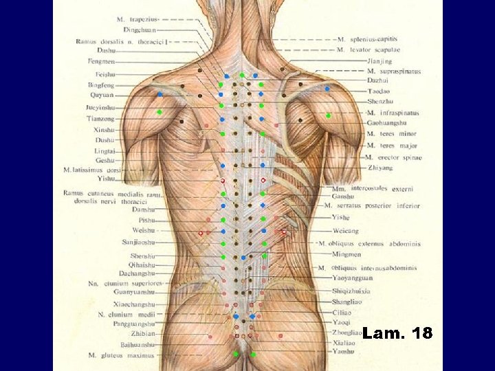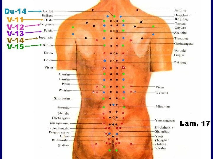 1. Dazhui Du-14 2. Dingchuan (extra. ) 3. Jianzhen ID-9 4. Naoshu ID-10 5. Dashu V-11 6. Fengmen V-12 7. Feishu V-13 8. Jueyinshu V-14 9. Xinshu V-15 10. Geshu V-17 11. Yishu (extra. ) 12. Ganshu V-18 13. Danshu V-19 14. Pishu V-20 15. Weishu V-21 16. Pee Gun (extra. ) 17. Sanjiaoshu V-22 18. Shenshu V-23 19. Mingmern Du-4 20. Ciliao V-32 21. Huiyang V-35