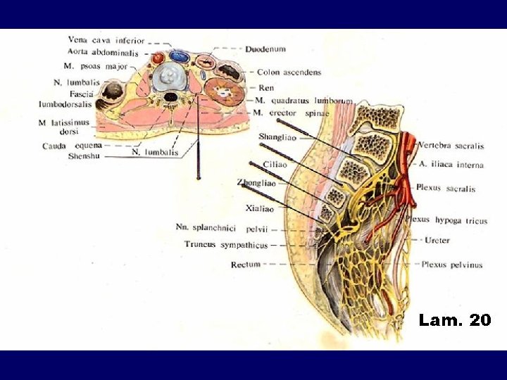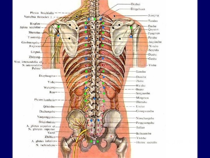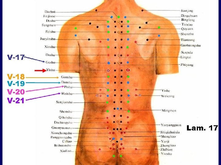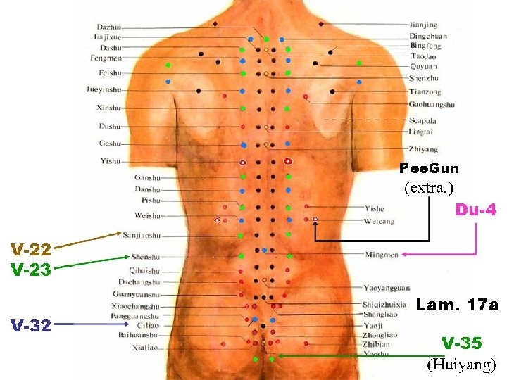 • Sanjiaoshu (V-22): 1. 5 cun lateral respecto del proceso espinoso de L-1. • Shenshu (V-23): 1. 5 cun lateral respecto del proceso espinoso de L-2. • Ciliao (V-32): al nivel del 2° agujero sacro. • Pee Gun (extra. ): 3. 5 cun lateral respecto del proceso espinoso de T-12. • Mingmen (Du-4): inmediatamente debajo del proceso espinoso de L-2. • Huiyang (V-35): la nivel del extremo del coxis, 0. 5 cun lateral respecto a la línea media.