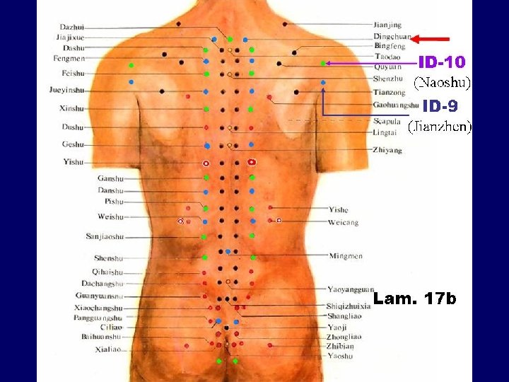 • Dingchuan (extra. ): entre 0. 5 y 1 cun lateral respecto a Du-14. • Jiazhen (ID-9): 1 cun por encima del extremo del pliegue axilar posterior. • Naoshu (ID-10): en una depresión que se palpa directamente por encima d e. ID-9, por debajo de la espina escapular.