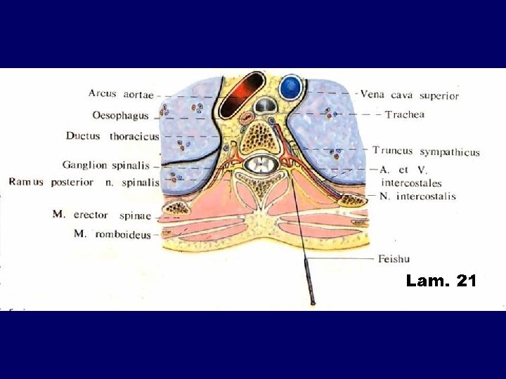 • Geshu (V-17): 1. 5 cun lateral respecto del proceso espinoso de T-7. • Yishu (o Weiguanxiashu) (extra. ): 1. 5 cun lateral respecto del proceso espinoso de T-8. • Ganshu (V-18): 1. 5 cun lateral respecto del proceso espinoso de T-9. • Danshu (V-19): 1. 5 cun lateral respecto del proceso espinoso de T-10. • Pishu (V-20): 1. 5 cun lateral respecto del proceso espinoso de T-11. • Weishu (V-21): 1. 5 cun lateral respecto del proceso espinoso de T-12.