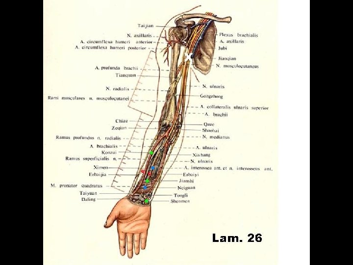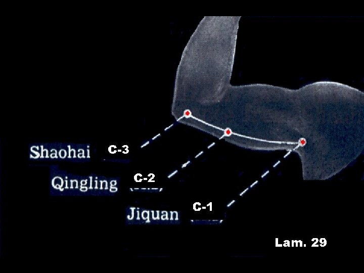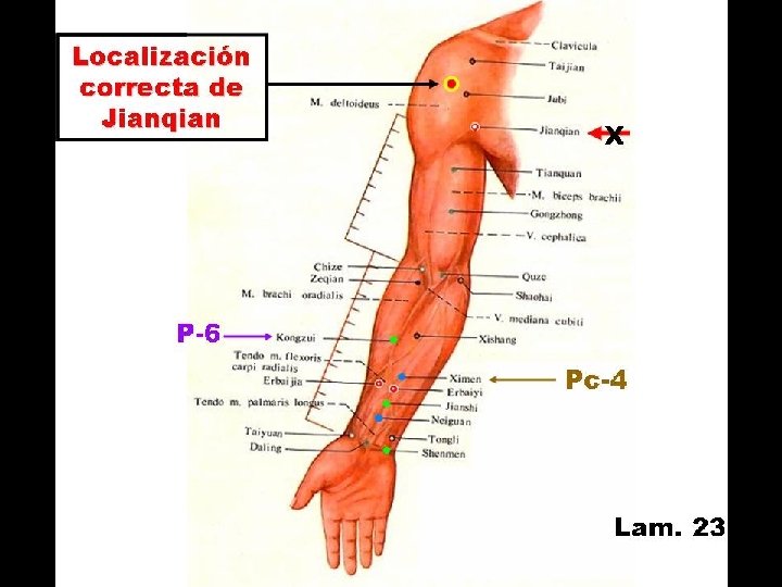 • Jianqian (extra. ): en el centro de una línea que una el extremo del pliegue axilar anterior con IG-15. • Kongzi (P-6): sobre una línea recta que una los puntos P-9 y P-5, 5 cun por debajo de P-5 o 7 cun por encima de P-9. • Ximen (Pc-4): 5 cun por encima del pliegue de la muñeca, entre los tendones de los músculos palmar y flexor del carpo; o sobre una línea que una Pc-3 y Pc-7, 5 cun por encima de Pc-7.
