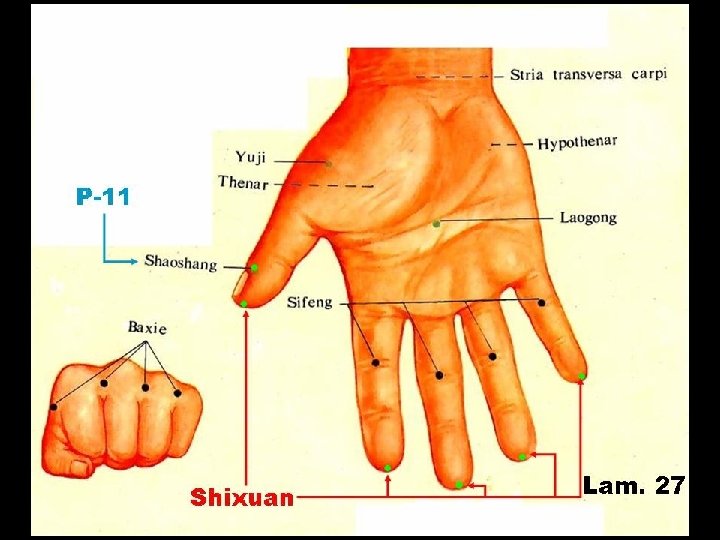 • Shaoshang (P-11): a 0. 1 cun del ángulo ungueal radial dedo pulgar. • Shixuan (extra. ): en el extremo de los cinco dedos de la mano.