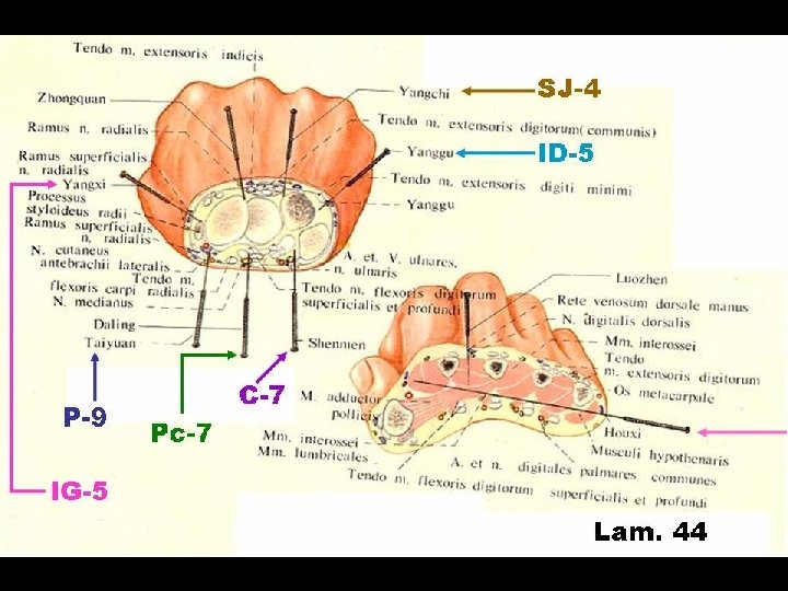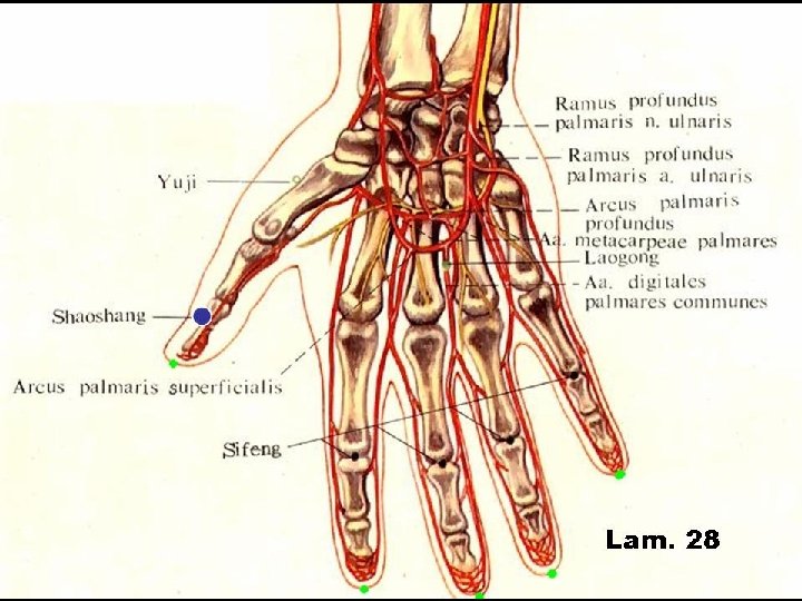 1. Kongzui P-6 2. Shaoshang P-11 3. Shangyang IG-1 4. Erjian IG-2 5. Erbai (extra. ) 6. Hegu IG-4 7. Yangxi IG-5 8. Shousanli IG-10 9. Quchi IG-11 10. Jiquan C-1 11. Shenmen C-7 12. Shaochong C-9 13. Shaoze ID-1 14. Houxi ID-3 15. Ximen Pc-4 16. Jianshi Pc-5 17. Neiguan Pc-6 18. Guanchong SJ-1 19. Yemen SJ-2 20. Yangchi SJ-4 21. Waiguan SJ-5 22. Zhigou SJ-6 23. Shixuan (extra. ) 24. Jianqian (extra. )