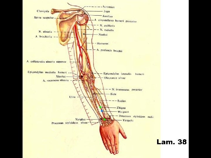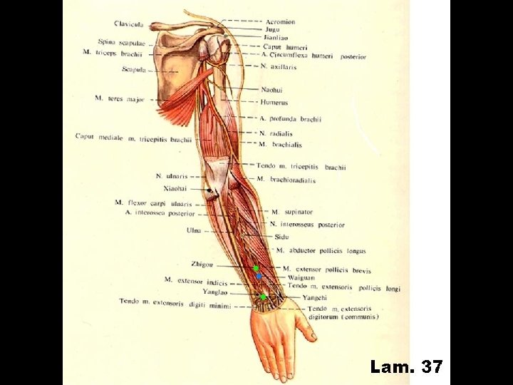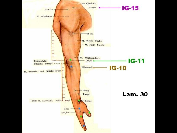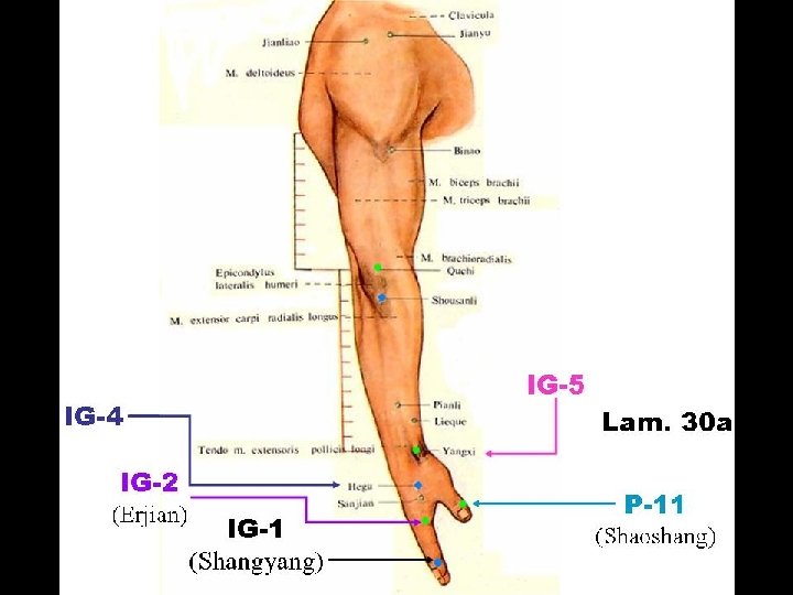 Expuestos ordenadamente de arriba hacia abajo en la cara lateral, tenemos: • • Shousanli IG-10 Quchi IG-11 Yangxi IG-5 Hegu IG-4 • Erjian IG-2 • Shangyang IG-1 • Shaoshang P-11