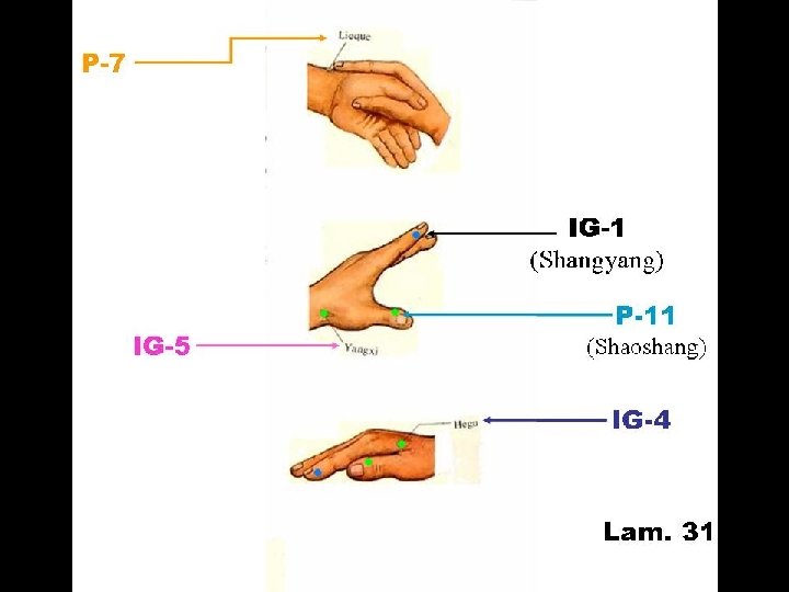 • Hegu (IG-4): en el punto más elevado de una prominencia que se forma al presionar el 1° y 2° metacarpiano. • Erjian (IG-2): sobre el borde radial dedo índice, en una depresión que se palpa distal, inmediatamente después de la articulación metacarpo-falángica, donde la piel cambia de coloración. • Shangyang (IG-1): 0. 1 cun del ángulo ungueal radial dedo índice. • Yangxi (IG-5): en el centro de la tabaquera anatómica.