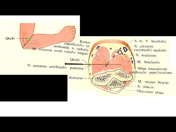 • Jianyu (IG-15): colocando el codo a la altura del hombro, en la más anterior de las dos depresiones que se forman al nivel del acromion. • Quchi (IG-11): con el antebrazo flexionado unos 90° sobre el brazo en una depresión que se palpa en el plano muscular en el extremo del pliegue que se forma. • Shousanli (IG-10): sobre una línea que una IG-11 con IG-5, 2 cun por debajo de IG-11.