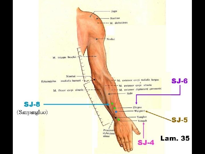 • Sanyangluo (SJ-8): entre el radio y la ulna, 4 cun por encima del pliegue posterior de la muñeca. • Zhigou (SJ-6): entre el radio y la ulna, 3 cun por encima del pliegue posterior d ela muñeca. • Waiguan (SJ-5): con la mano derecha sobre el hombro izquierdo o viceversa, entre el radio y la ulna, 2 cun por encima del pliegue posterior d ela muñeca. • Yangchi (SJ-4): sobre el pliegue posterior de la muñeca, en una depresión lateral al tendón del extensor común de los dedos.