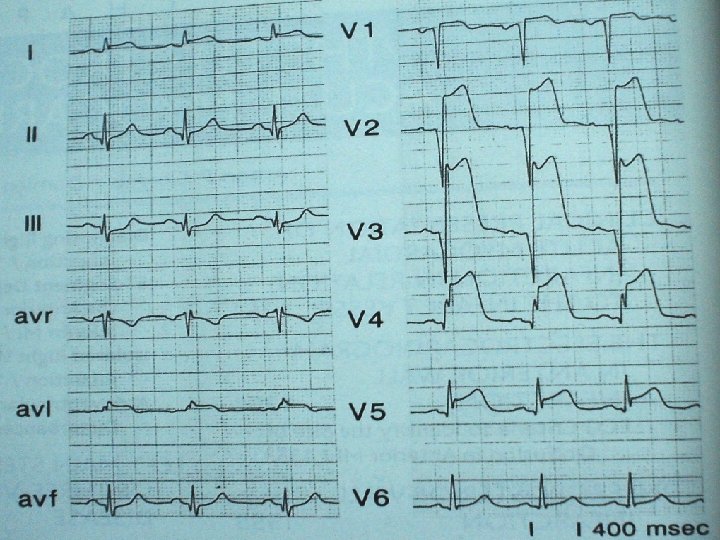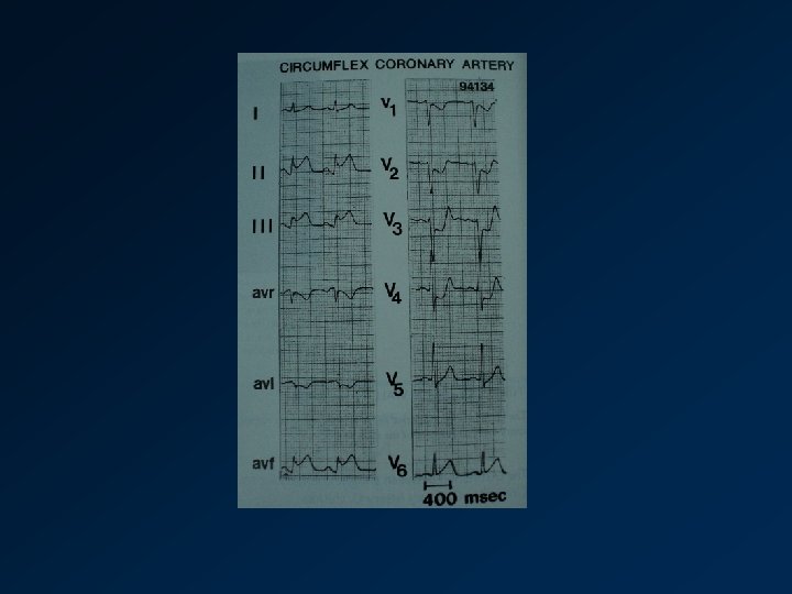 Distal LAD occlusion (dominance of inferoapical area) ECG… q Absence of ST depression in inferior leads q STE in inferior leads in addition to V 3 -V 6