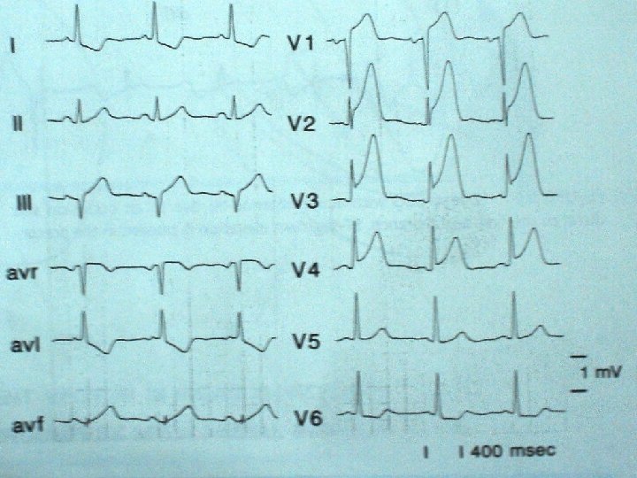 Proximal LAD occlusion (Dominance of Basal area) q ECG… q RBBB q STE a. VR and STE in V 1 > 2. 5 mm q ST depression in inferior leads and in V 5