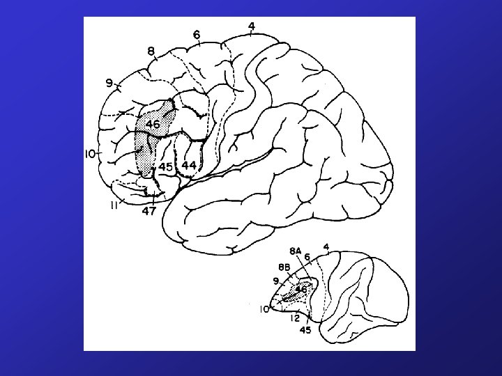 Corteccia prefrontale dorsolaterale • Aree 45, 46, 9 -12 di Brodmann • Memoria di lavoro spaziale mantenimento on-line dell’informazione per l’elaborazione e l’effettuazione dell’azione • Perseverazione