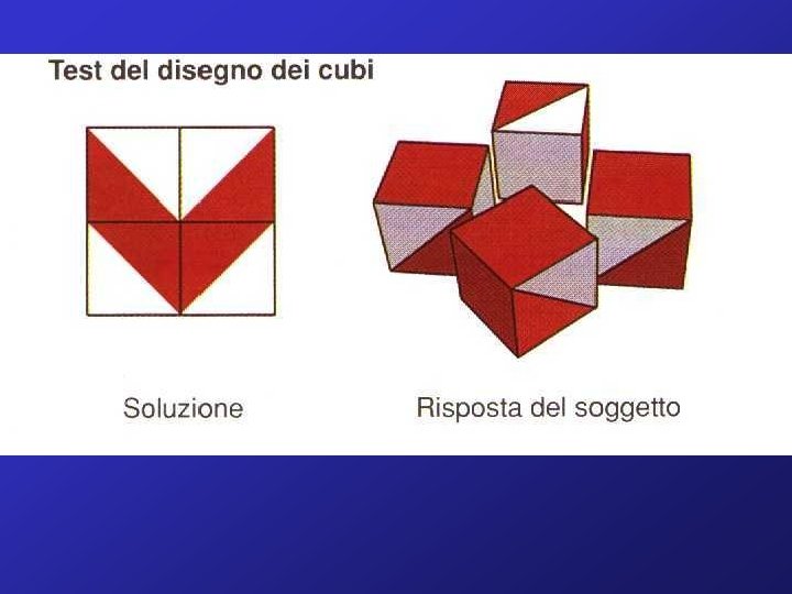 Disturbi da lesione prefrontale • • 2 deficit nel passare da un concetto o compito ad un altro, errori di “perseverazione” (non abbandonano la soluzione trovata anche se errata) che contribuiscono al difettoso apprendimento nei pazienti frontali Labirinto di Porteus, patologico Cubi di Khos, patologico Wisconsin Card Sorting Test: disporre le carte in pile secondo un criterio (colore, forma, numero) da scoprire per prove ed errori, patologico per mancato abbandono del criterio precedente