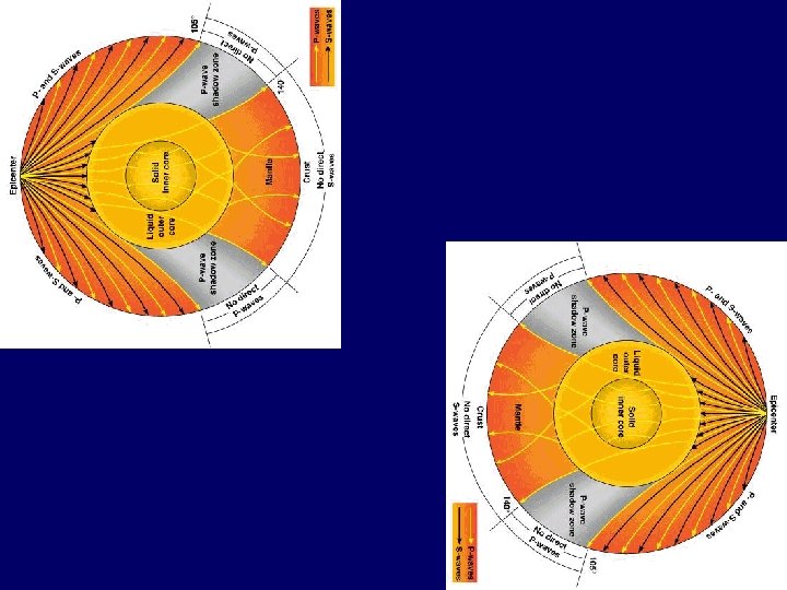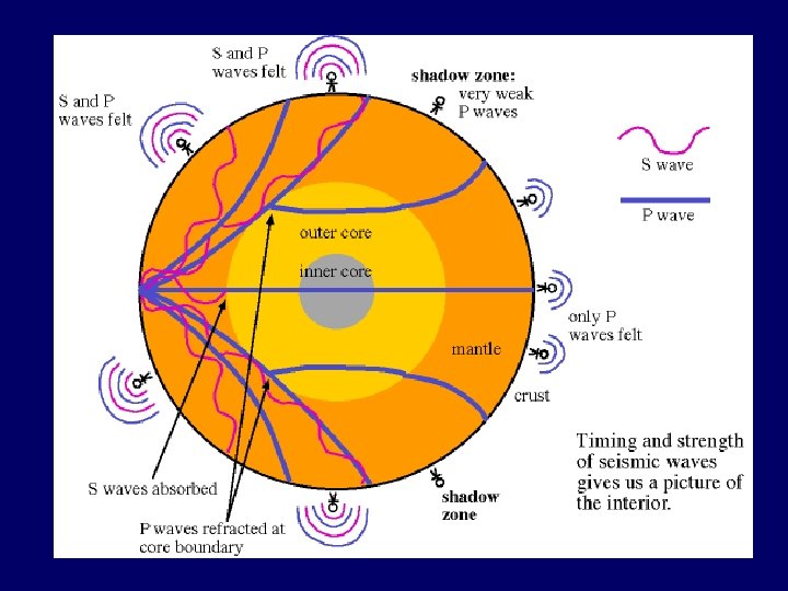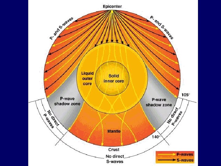Simplified ‘Shadow Zone” diagram Shadow Zone no waves receive both p-waves & s-waves epicenter receive only p-waves core Shadow Zone no waves
