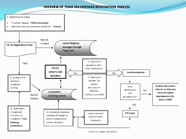 De-centralized Sex Offender Registration, Monitoring, and Location �Texas: In Texas, the initial registration, monitoring compliance, and absconder location/apprehension is a decentralized function; in some parts of the state( e. g. Dallas) Multi-Agency Task Forces have been established, but in many areas the responsibility falls on local police departments. The statewide sex offender registry data base is maintained by the State Office of Public Safety. �California: In California, monitoring compliance and absconder location/apprehension is decentralized , and county task forces have been established and maintained utilizing Federal grants to support the program, including overtime for project personnel and access to technology designed to locate missing sex offenders.
