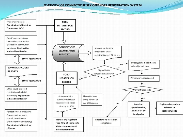 Hybrid Model �Connecticut: In Connecticut, a hybrid model is used. There is a centralized registration process managed by the State Police’s Sex Offender Registry Unit. � Responsibility for locating and apprehending missing/non-compliant sex offenders is generally decentralized and left to local police agencies throughout the state. �However, the State Police in Connecticut are involved in location and apprehension if the sex offender’s last known residence is in one of the towns covered by the state police.