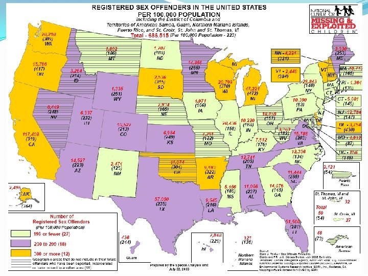 The Community Control of Sex Offenders: New Initiatives � Lifetime Supervision: Legislation has been passed allowing lifetime probation or parole supervision for convicted sex offenders in twenty six states; in these jurisdictions, GPS monitoring of offender location and movement is also the norm. � New Classification and Reporting Procedures: Adam Walsh Act requirements –if implemented fully—will increase the size of the registered sex offender population, and mandate uniform offense-driven reporting requirements. To date, only Ohio has substantially met these requirements. � Residency Restrictions: Many jurisdictions have passed legislation that restricts registered sex offenders from living near schools, parks, libraries, bus stops, and other places where children congregate. � Monitoring the Homeless Sex Offender Population: Due to residency restrictions, a growing number of sex offenders are registering as homeless, which requires new strategies for monitoring this subgroup of registered sex offenders.