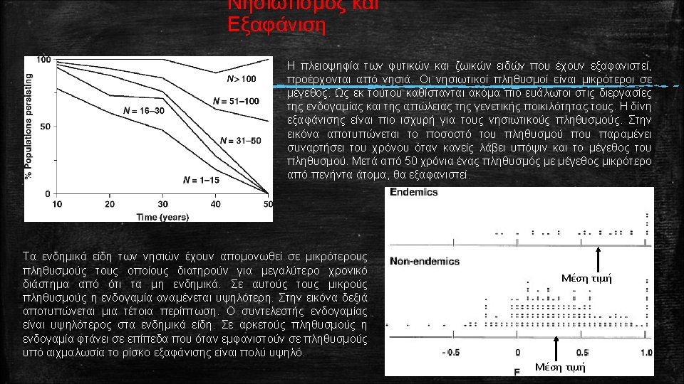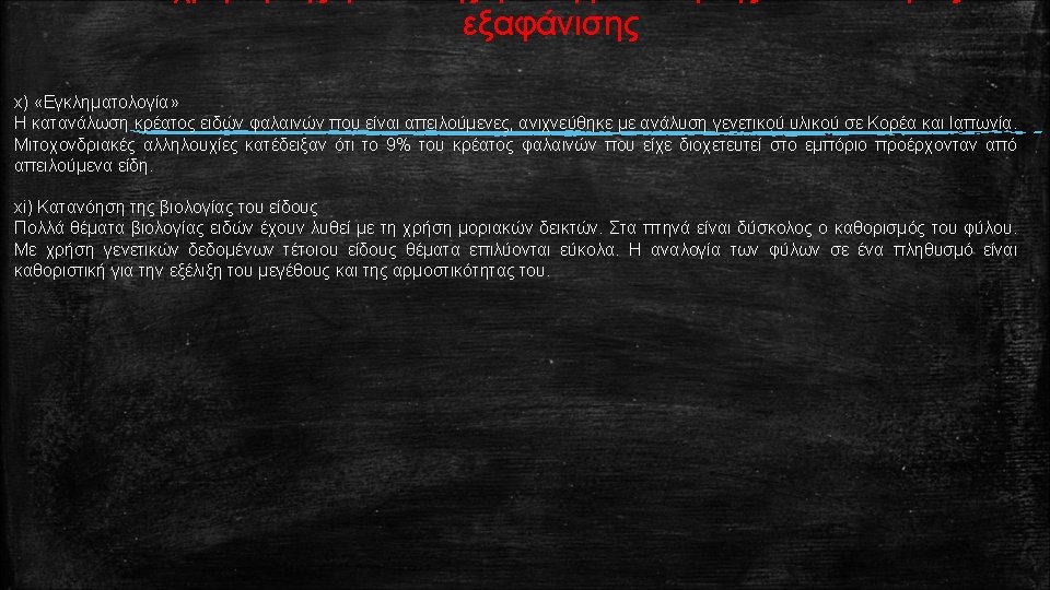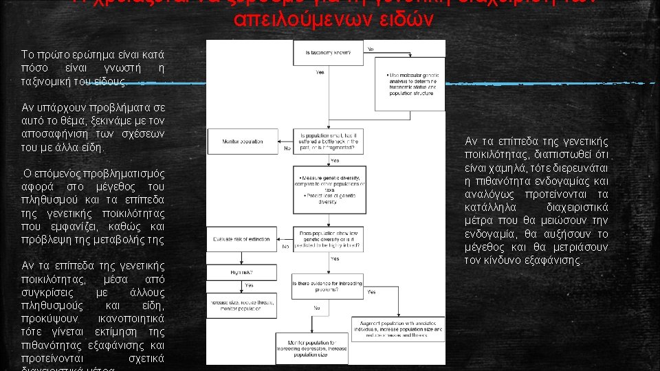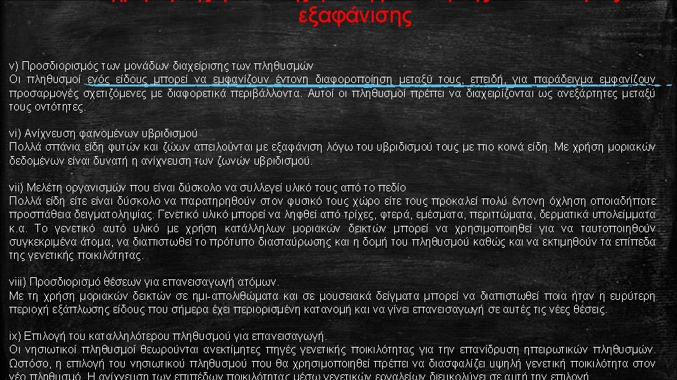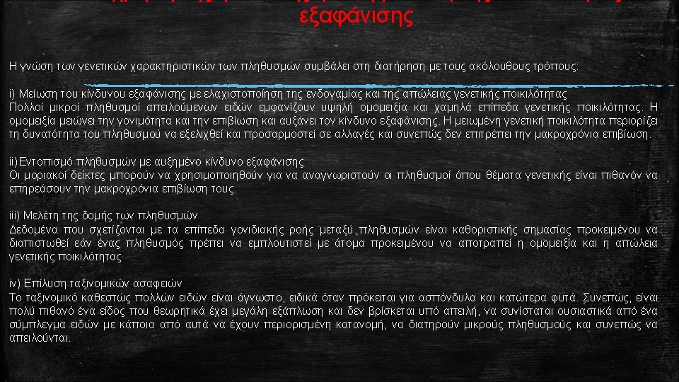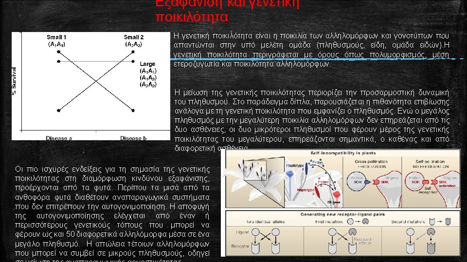 Ορολογία που χρησιμοποιείται για την περιγραφή της γενετικής ποικιλότητας Polymorphic locus: The presence in a species of two or more alleles at a locus, e. g. A 1 and A 2. Polymorphic loci are usually defined as having the most frequent allele at a frequency of less than 0. 99, or less than 0. 95 (to minimize problems with different sample sizes). Monomorphic locus: A locus in a population is monomorphic if it has only one allele present, e. g. A 1. All individuals are homozygous for the same allele. Lacking genetic diversity. Proportion of loci polymorphic (P) Number of polymorphic loci / total number of loci sampled. For example, if 3 of 10 sampled loci are polymorphic, and 7 are monomorphic, P = 3 /10 = 0. 3 Average heterozygosity (H): Sum of the proportions of heterozygotes at all loci / total number of loci sampled. For example, if the proportions of individuals heterozygous at 10 loci in a population are 0. 2, 0. 4, 0. 1, 0, 0, 0, and 0, then H = (0. 2 + 0. 4 + 0. 1 + 0 + 0) /10 = 0. 07. Typically, expected heterozygosities (see below) are reported, as they are less sensitive to sample size than observed heterozygosities. In random mating populations, observed and expected heterozygosities are usually similar. Allelic diversity (A): average number of alleles per locus. For example, if the number of alleles at 10 loci are 2, 3, 2, 1, 1, 1 and 1, then A = (2 + 3 + 2 + 1 + 1) /10 = 1. 4. Co-dominance: Situation where all genotypes can be distinguished from phenotypes i. e. A 1 A 1, A 2 A 2, A 1 A 2 can be distinguished. This contrasts dominance where the phenotypes of some genotypes are indistinguishable.