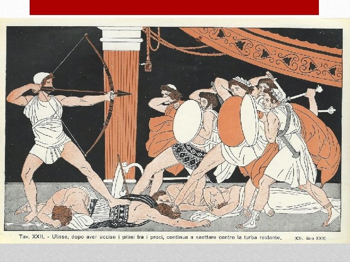 3. CANTI XIII-XXIV: i Feaci, commossi, riconducono Ulisse a Itaca. - qui, trasformato in un medicante da Atena incontra Telemaco alla capanna di Eumeo e i due si riconoscono; - Il giorno dopo, si reca alla reggia: solo il cane Argo lo riconosce, i Proci lo deridono, Penelope è gentile ma non lo riconosce; - Intanto, Penelope propone la gara dell’arco, ( chi riuscirà a fare centro diventerà suo sposo). Ulisse vince e fa strage dei Proci, Penelope lo riconosce e Ulisse si riconcilia con i suoi sudditi.